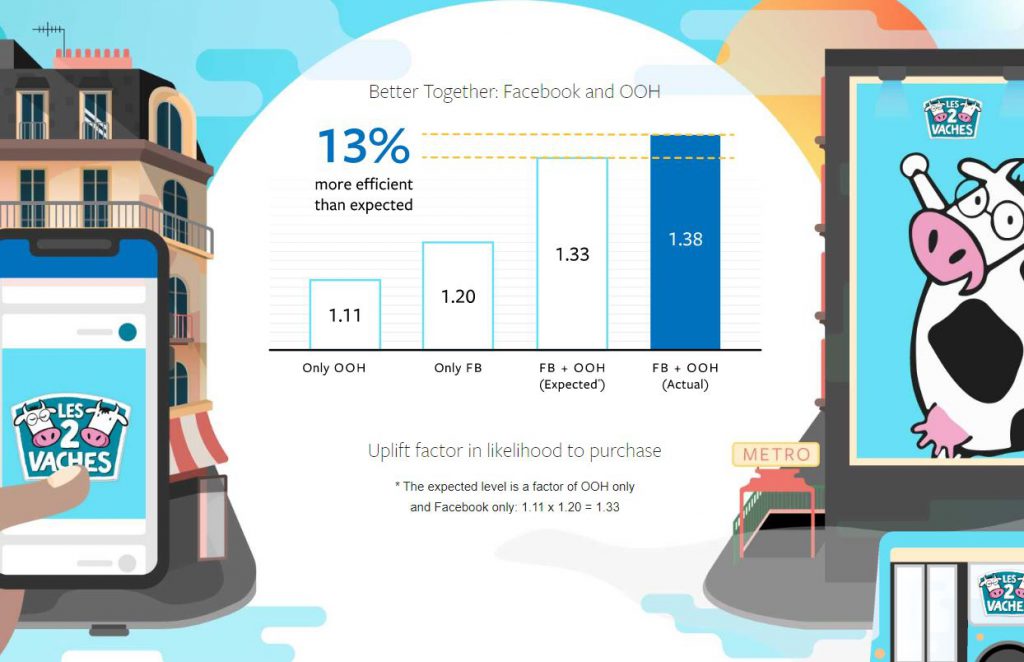 Đối với yếu tố đầu tiên trong nghiên cứu , Facebook đã kiểm tra kết quả cụ thể của một chiến dịch Facebook kết hợp với OOH gần đây do Danone triển khai. Thương hiệu đã tìm cách tiếp cận người mua mới của sản phẩm sữa chua hữu cơ của Pháp. Danone sử dụng TV, OOH và quảng cáo Facebook cho chiến dịch của mình.