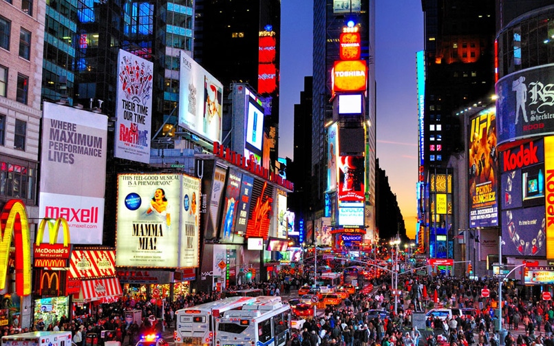 Quảng trường Thời Đại New York Mỹ hay còn gọi Times Square được xem là đại lộ danh vọng danh giá nhất hành tinh cuốn hút hàng triệu lượt khách dụ lịch mỗi năm. Không những vì sự sầm uất của các trung tâm thương mại – tài chính toàn cầu mà còn có sự đóng góp của ngành công nghiệp quảng cáo đã “hô biến” Quảng trường Thời Đại trở thành “đại lộ ánh sáng” với hàng loạt biển quảng cáo trên khắp phố Times Square.