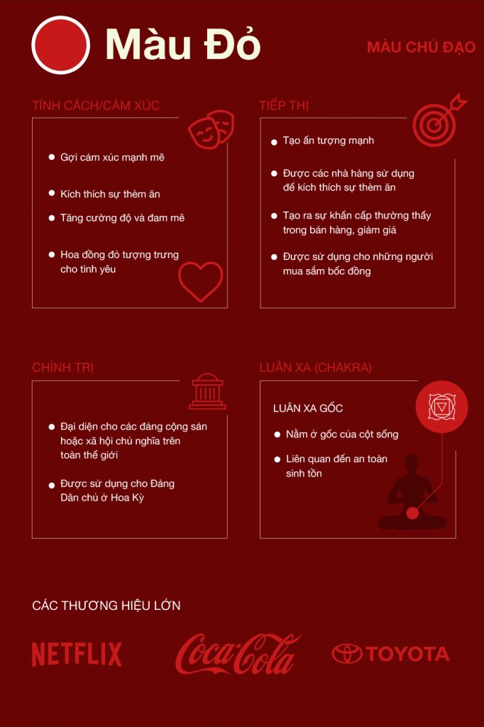 Là biểu tượng của quyền lực, lòng quyết tâm, dũng cảm và hi sinh. Bên cạnh đó, màu đỏ còn là màu của may mắn, cảm xúc và tình yêu. Nhiều nghiên cứu chỉ ra màu đỏ kích thích cảm giác thèm ăn, đó là lý do chúng ta thường thấy các thương hiệu đồ ăn nhanh hay sử dụng màu đỏ chủ đạo. Tuy nhiên cần phải thận trọng khi đưa màu đỏ lên biển quảng cáo lớn, bởi màu đỏ mang lại hiệu ứng khá gắt, dễ gây khó chịu cho người nhìn.