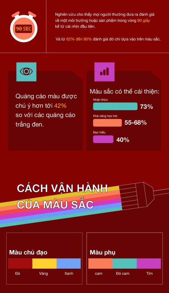 Với 6 màu cơ bản, infographic sau đây sẽ hướng dẫn cho chúng ta những kiến thức về tâm lý học màu sắc bao gồm: