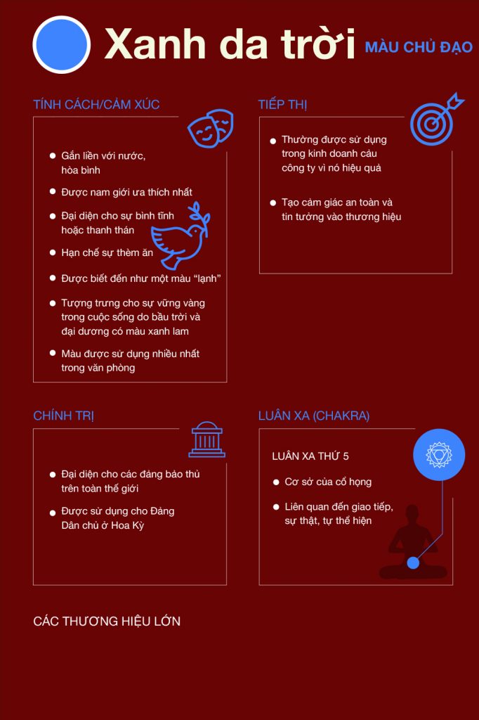 Là màu có thể đem lại cảm giác bình yên, an nhàn cho con người, tạo cảm giác về sự vững chắc, bình ổn, minh bạch. Tuy nhiên, đây là một màu sắc khá nhạy cảm nếu không sử dụng đúng cách, màu xanh dương sẽ mang tới cảm giác lạnh lẽo, tiêu cực.