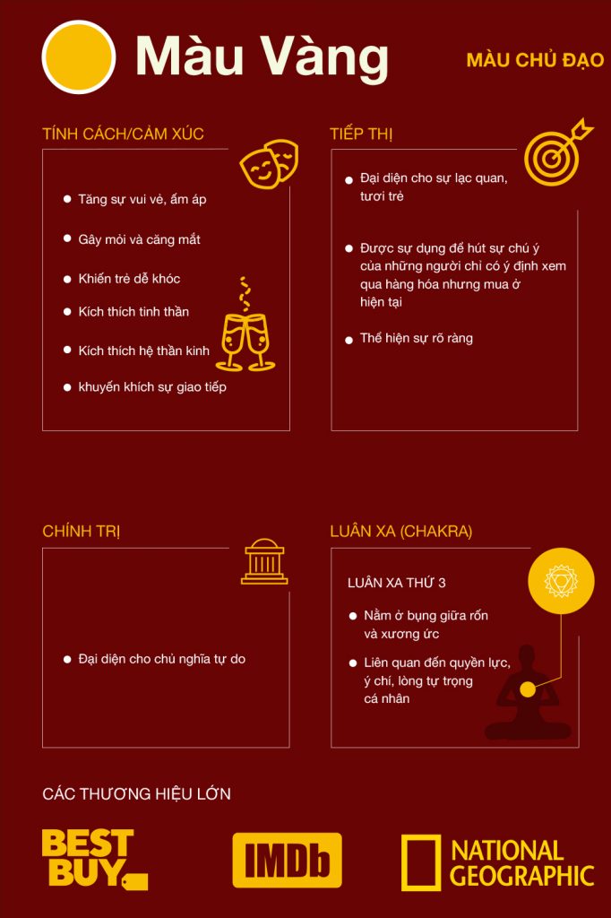 Là màu của nắng mặt trời ấm áp gắn liền với cảm giác hạnh phúc, làm tăng sự thích thích thú và khả năng hoạt động của trí óc. Bên cạnh đó, theo một số nghiên cứu, khi sử dụng màu vàng quá mức sẽ mang đến sự khó chịu và giận dữ, trẻ sơ sinh sẽ khóc nhiều hơn trong căn phòng màu vàng.