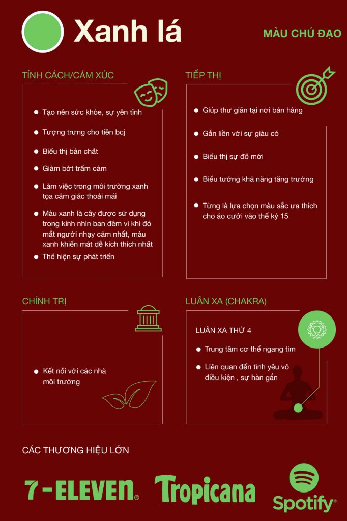 Không chỉ là màu của thiên nhiên mà còn tượng trưng cho sự phát triển, hòa thuận, tươi mát màu mỡ. Màu xanh lá cây còn mang lại cảm xúc an toàn. Đây là lý do tại sao đèn giao thông sử dụng màu xanh lá báo hiệu được phép đi. Nếu bạn đang ở trong lĩnh vực sức khỏe hoặc các sản phẩm liên quan tới nguồn gốc tự nhiên, doanh nghiệp có thể chọn thêm nhiều màu xanh lá cây vào thiết kế quảng cáo của mình, ví dụ như: hình ảnh hoặc logo, thông điệp quảng cáo,…